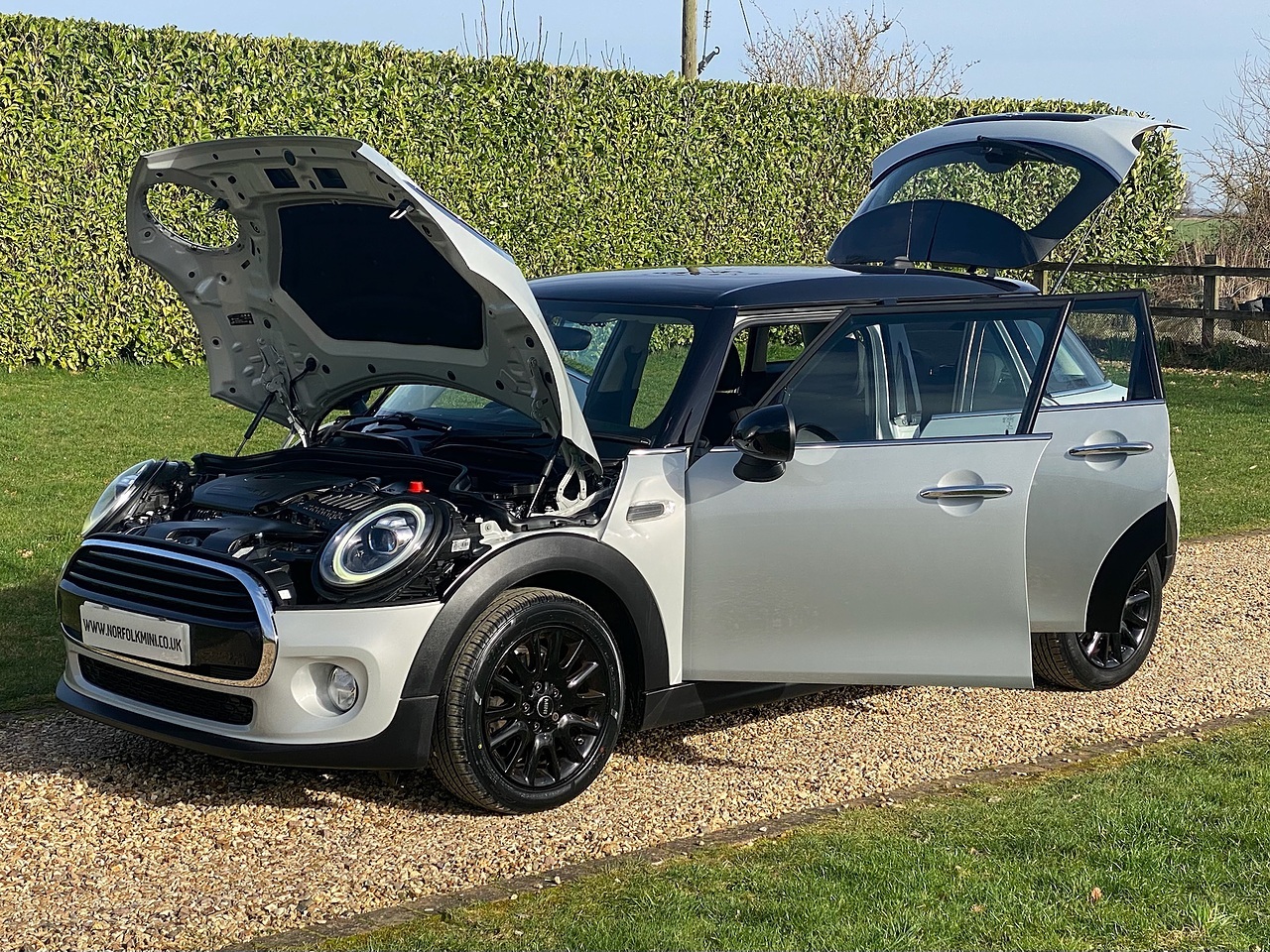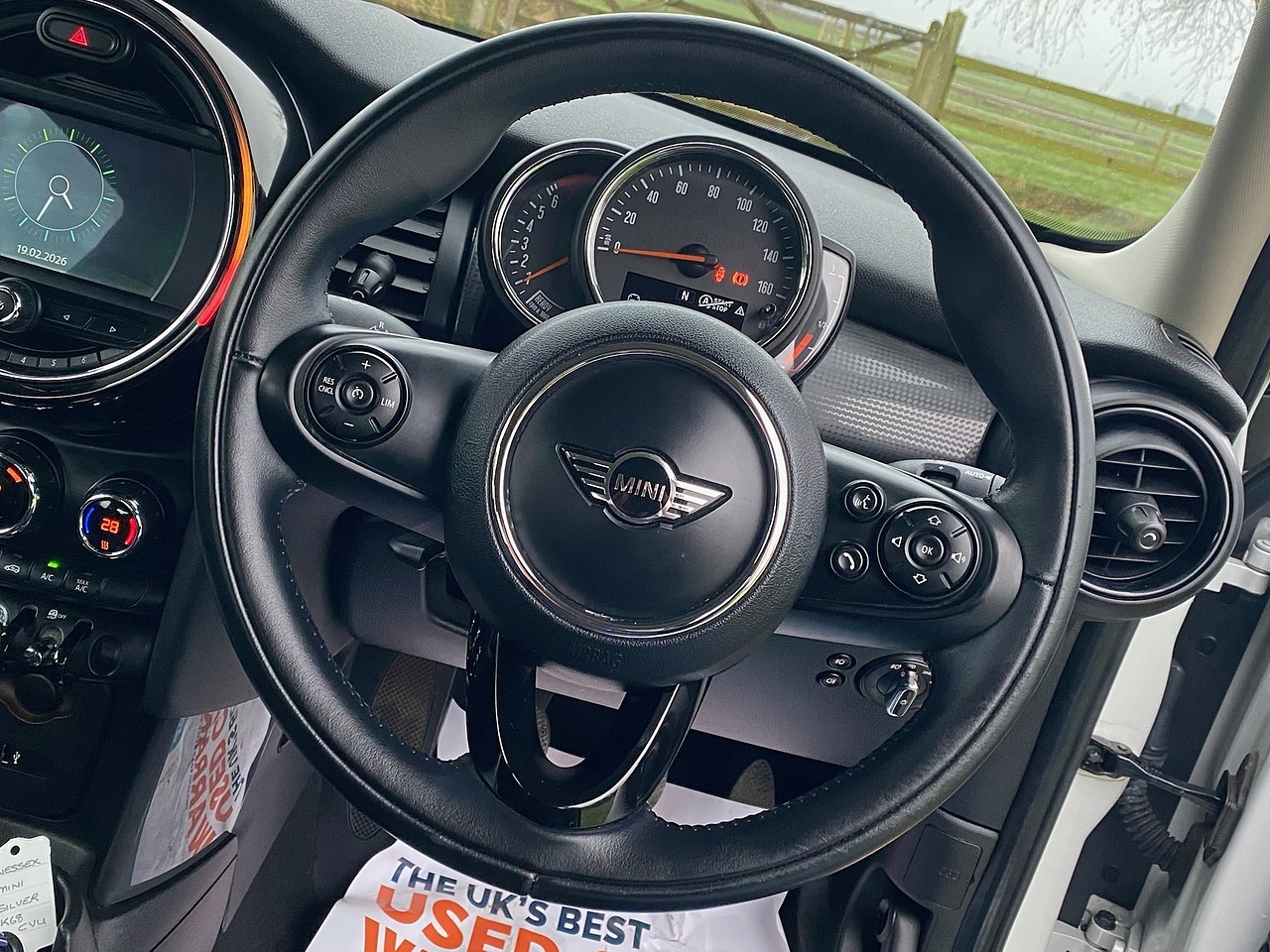 A great specification Mini Cooper finished in Metallic white silver with black roof and mirror caps. In addition to the Pepper pack, this Mini has the optional Satellite Navigation pack with Apple car play, 16" Gloss black victory spoke alloy wheels, Rear carrier preparation, and Leather multifunction steering wheel with Cruise control. Pepper Pack includes Passenger seat height adjustment, Storage compartment pack, Excitement pack, Onboard computer, Leather steering wheel, Dual zone Climate control , Auto dimming rear view mirror, Auto lights, White indicator lenses, Fog lights, and DRL's. Standard features also include Bluetooth connectivity, ABS brakes, Electric windows, Electric mirrors, Remote central locking, Power steering, and Multiple airbags. The car has a full service history and MOT until February 2027 with no advisories. Keep this vehicle in super condition, ask about our lifetime paintwork guarantee. Buy with confidence, this vehicle comes complete with Full Book Pack, HPI clear certificate, Two keys, and a comprehensive used car inspection. Any trial or inspection welcome, and a warranty is included. Finance is available subject to status. Viewings by appointment.